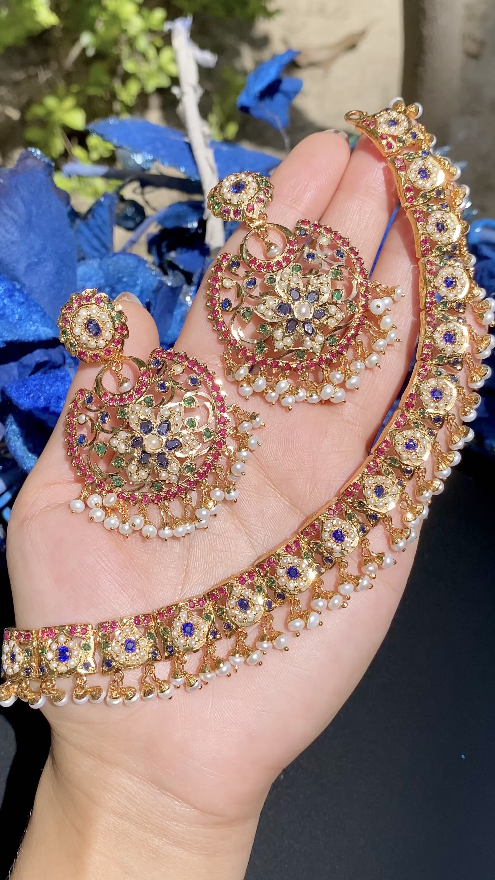 पेश है हमारा शानदार गोल्ड प्लेटेड जड़ाऊ सेट, जिसे सटीकता से तैयार किया गया है और नाजुक ताजे पानी के मोती, जीवंत लाल माणिक, गहरे नीले नीलम और समृद्ध हरे पन्ने से सजाया गया है। हमारे प्रीमियम मटीरियल और बेहतरीन डिज़ाइन के साथ अपनी स्टाइल को बढ़ाएं और शान से पेश आएं।
