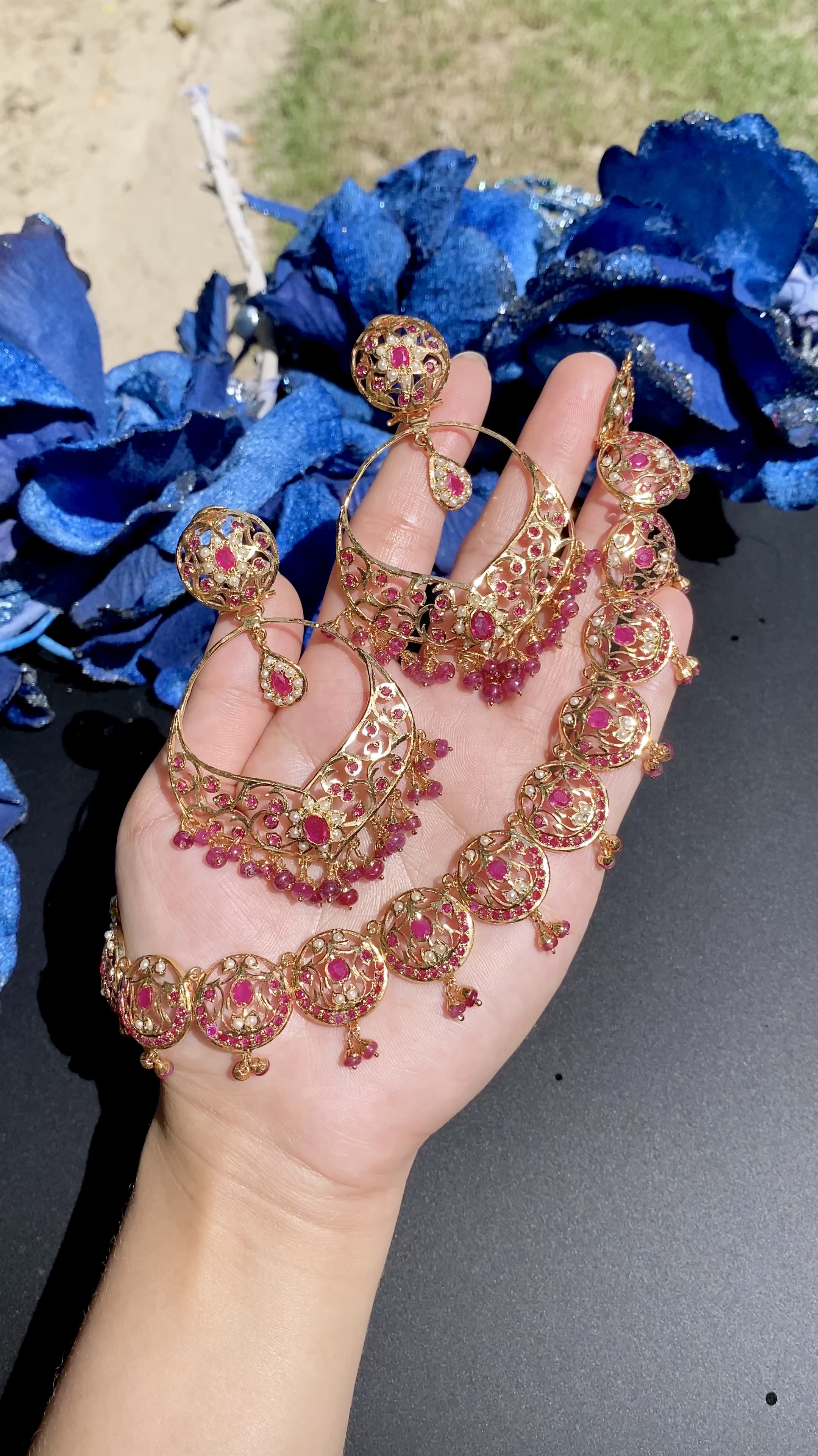 स्टेटमेंट इयररिंग्स के साथ नाज़ुक रूबी नेकलेस | जादौ ज्वेलरी | NS 309