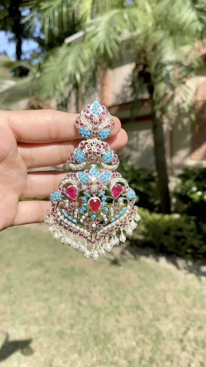 स्टर्लिंग सिल्वर पर बने बड़े स्टेटमेंट इयररिंग्स की एक जोड़ी, जिसमें मोती, फ़िरोज़ा और रूबी जैसे लाल पत्थर जड़े हुए हैं। इयररिंग्स पहनने में आसानी के लिए फ्रेंच क्लिप के साथ आते हैं और बॉम्बे स्क्रू से बंद होते हैं।