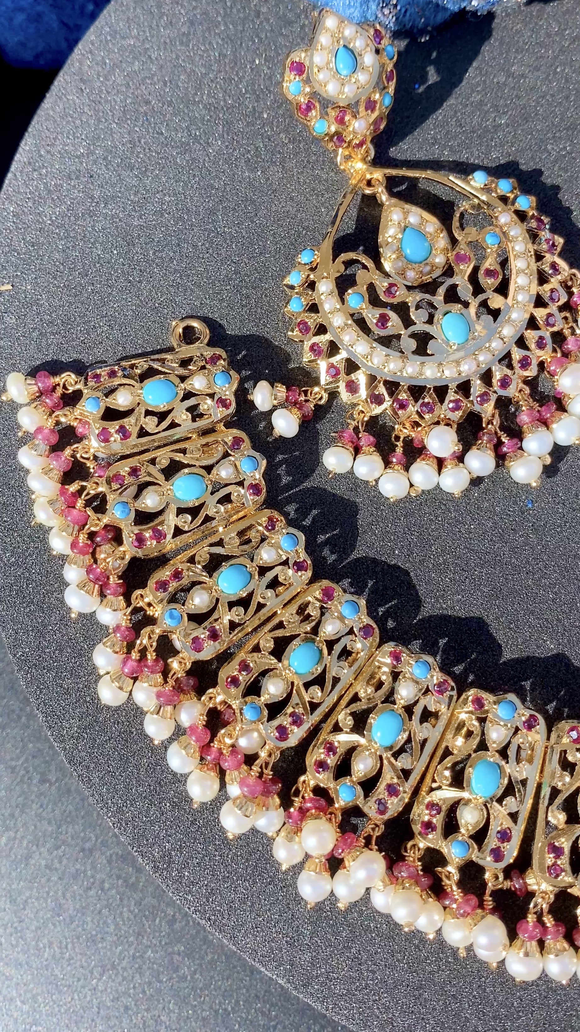 इसमें ताजे पानी के मोती, असली फ़िरोज़ा और माणिक जैसे लाल पत्थरों से जड़ा हुआ एक बहुरंगी जड़ाऊ हार सेट शामिल है। लटकते हुए मोतियों में कीमती माणिक और ताजे पानी के मोती शामिल हैं।