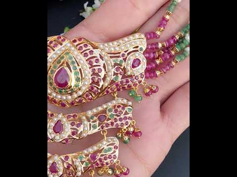 इसमें 22k सोने की बालियों के साथ एक विस्तृत लेकिन हल्का जड़ाऊ चोकर नेकलेस शामिल है। इस ज्वेलरी सेट को कीमती माणिक, पन्ना और ताजे पानी के मोतियों से सजाया गया है।