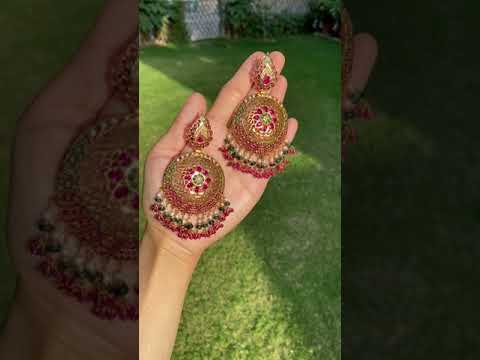 विशेष रुप से प्रदर्शित सोने की परत चढ़ी चांदी की एक जोड़ी, कीमती ताजे पानी के मोती और लाल/हरे पत्थरों के साथ बड़े आकार की, स्टेटमेंट इयररिंग हैं जो माणिक और पन्ना की तरह दिखते हैं। लटकते हुए मोतियों में असली माणिक और पन्ना शामिल हैं जो अच्छे लगते हैं रंग और स्पष्टता। बालियों का वजन लगभग 48 ग्राम और एक फ्रेंच क्लिप के साथ आते हैं। बालियों का माप 9.5 सेमी x 4.5 सेमी है