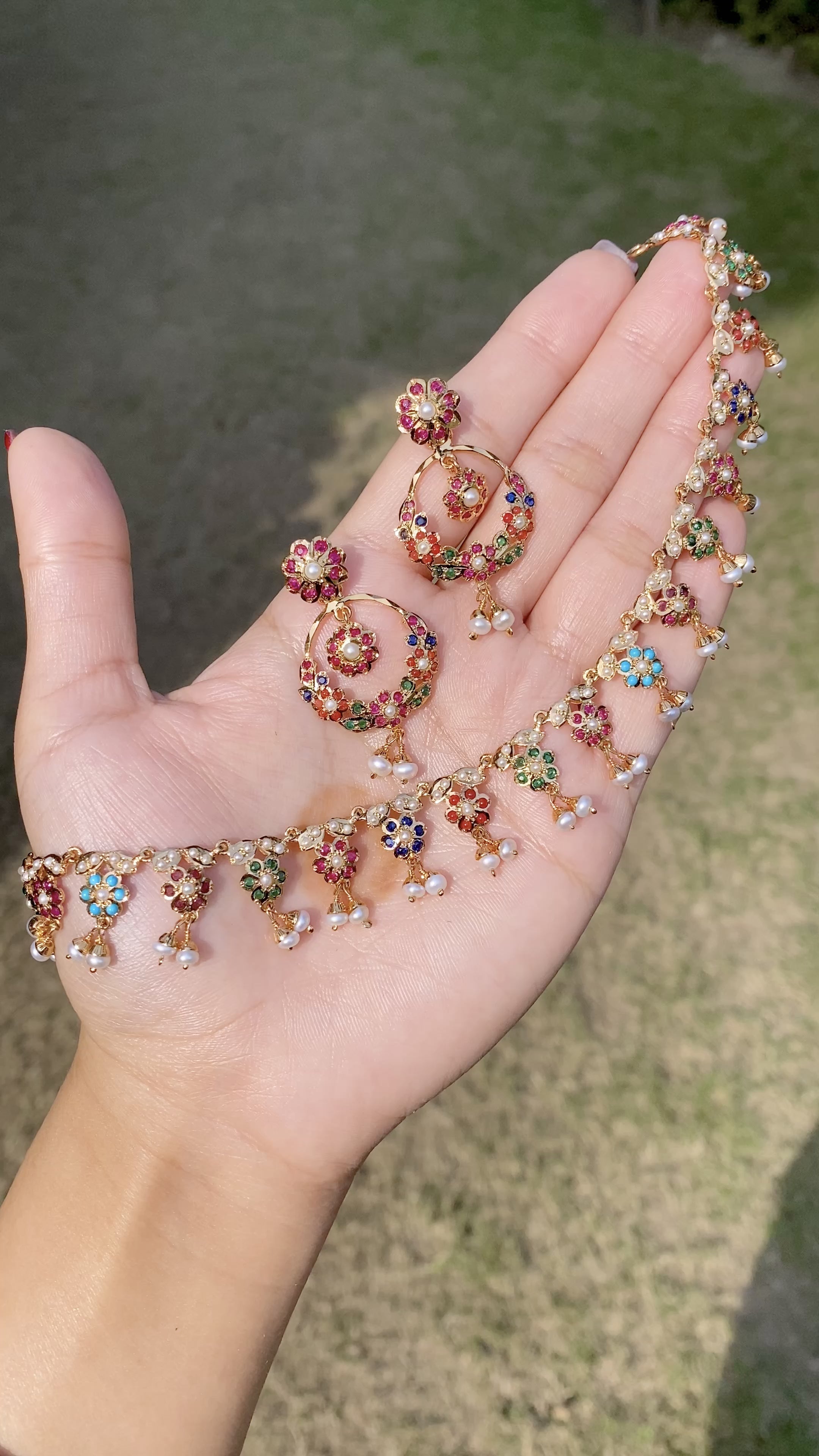 चांदबाली बालियों के साथ एक नाज़ुक और सुरुचिपूर्ण नवरत्न हार सेट की विशेषता। 925 स्टर्लिंग सिल्वर में हस्तनिर्मित और कीमती नवरत्न पत्थरों से अलंकृत।