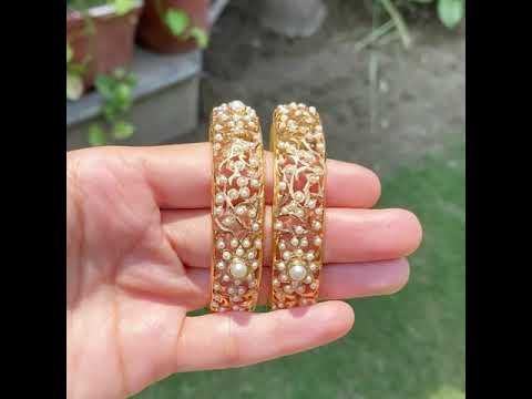 22k सोने की परत चढ़ी चांदी में एडवर्डियन युग से प्रेरित जड़ाऊ चूड़ियों की एक जोड़ी, जिसमें कीमती ताजे पानी के मोती जड़े हुए हैं। चूड़ियों का वजन 51 ग्राम है और इसकी चौड़ाई 1.25 सेमी है।