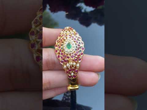 इसमें 22k सोने से बना एक सुंदर और बेहतरीन ढंग से तैयार किया गया समकालीन खुलने वाला ब्रेसलेट शामिल है। इसमें कीमती माणिक, पन्ना और मोती जड़े गए हैं।