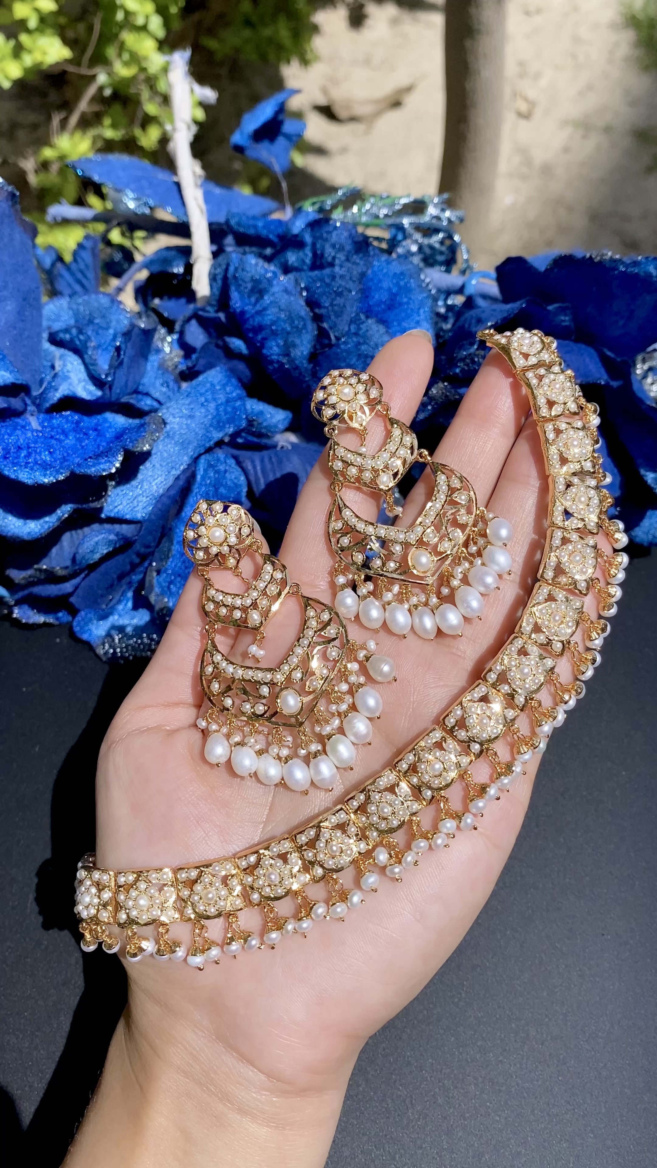 स्टेटमेंट इयररिंग्स के साथ मोती का हार | गोल्ड प्लेटेड 925 सिल्वर ज्वेलरी NS 308