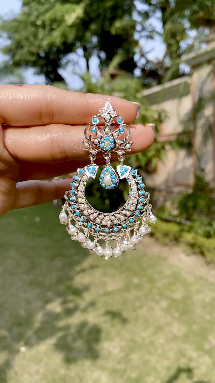 मोती और फ़िरोज़ा आभूषण | शुद्ध चांदी और पत्थर की बालियाँ SER 033