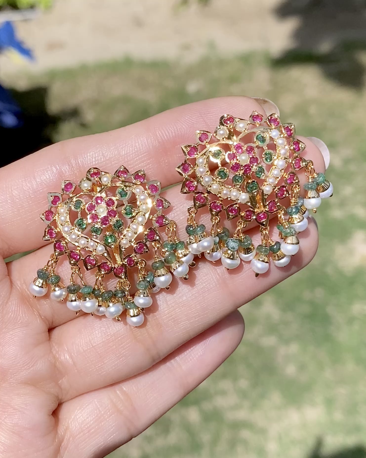इसमें सोने की परत चढ़ी स्टर्लिंग सिल्वर से बनी स्टड की जोड़ी है। इनमें मोती, माणिक जैसे लाल पत्थर और पन्ना जैसे हरे पत्थर जड़े हुए हैं। लटकते हुए मोतियों में मोती और असली पन्ना शामिल हैं। झुमके बॉम्बे स्क्रू से बंद होते हैं।