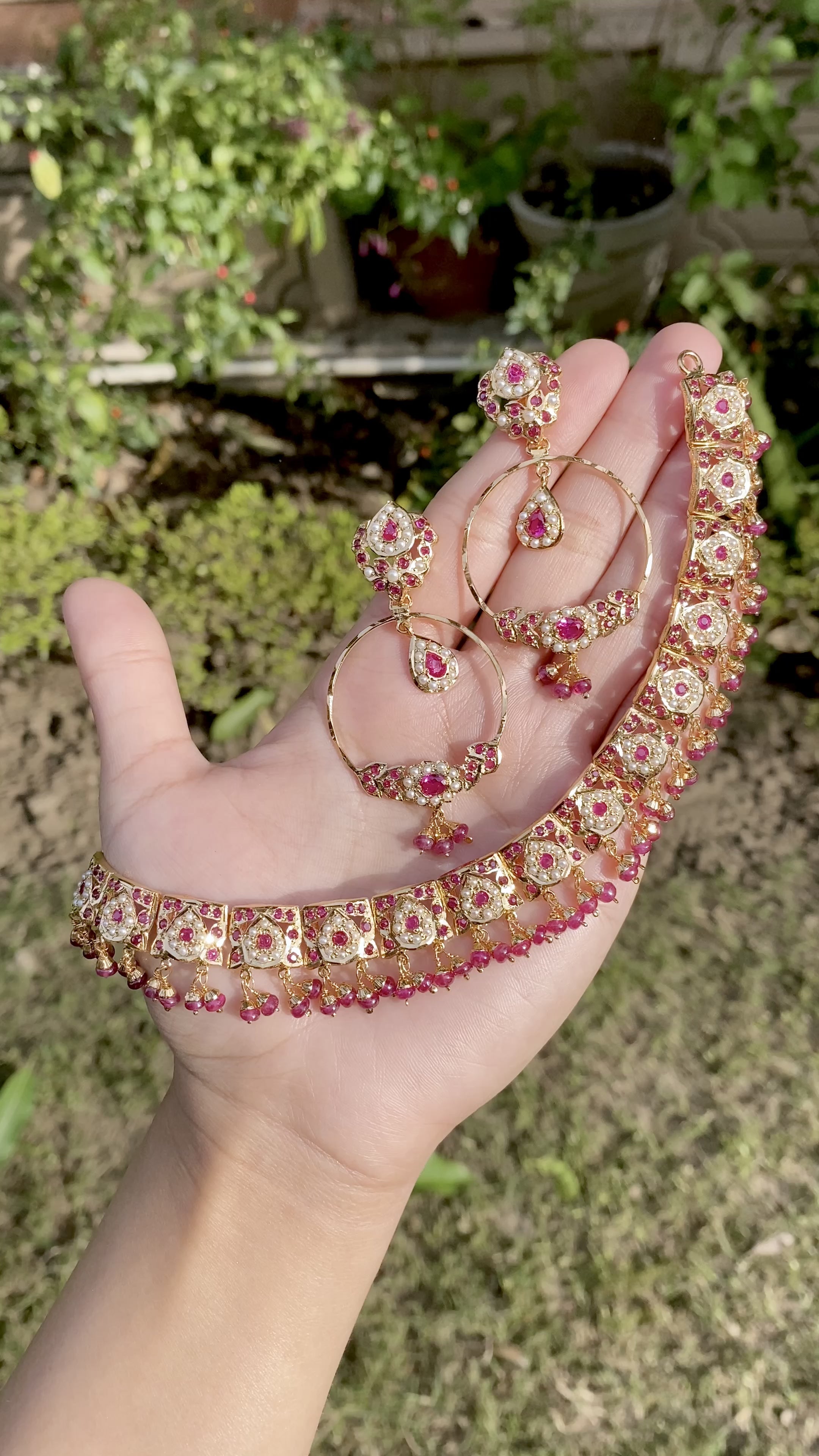 925 स्टर्लिंग सिल्वर में हस्तनिर्मित नेकलेस सेट। इसे कीमती मोतियों और रूबी जैसे दिखने वाले लाल पत्थरों से जड़ा गया है - आभूषण बनाने की पारंपरिक जड़ाऊ कला का उपयोग करके। यह अनोखा सेट कालातीत लालित्य और शैली का सहज मिश्रण है। 925 स्टर्लिंग सिल्वर में हस्तनिर्मित और कीमती मोतियों और रूबी लटकते मोतियों के साथ, यह किसी भी अलमारी के लिए एक शानदार अतिरिक्त है।