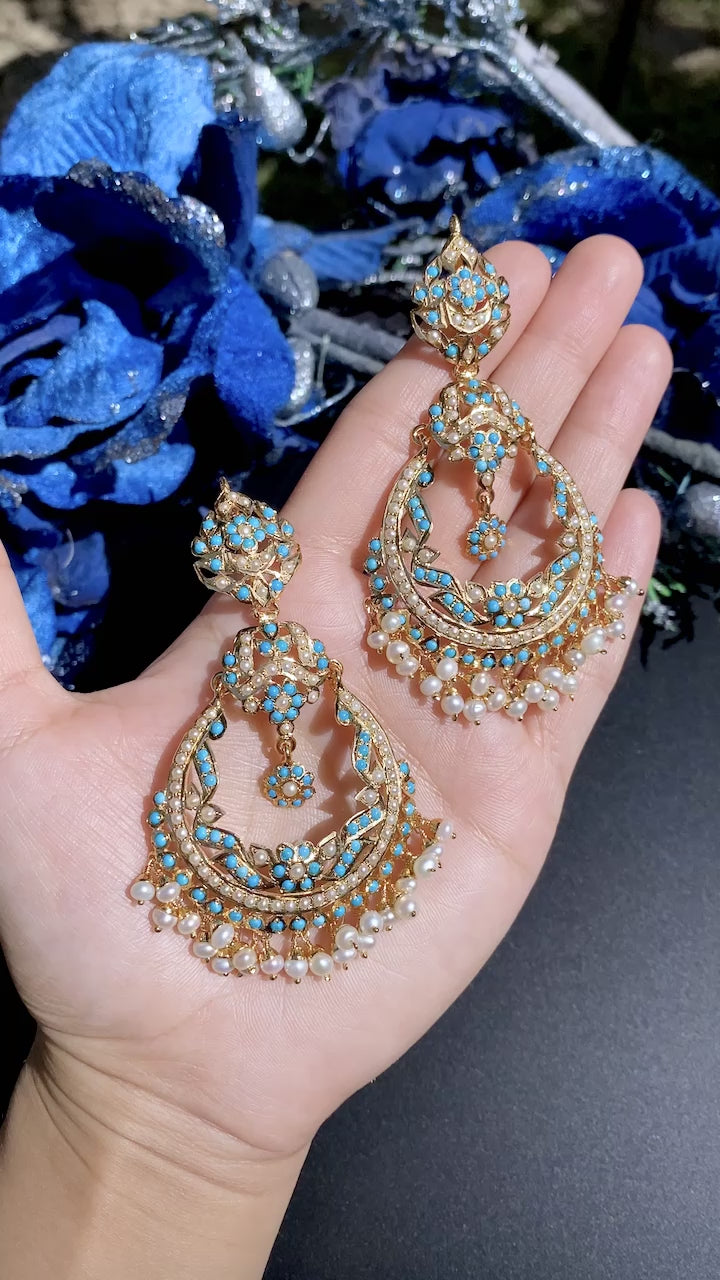 सोने की परत चढ़ी चांदी की लंबी चांदबाली बालियों की एक जोड़ी, ताजे पानी के मोती और फिरोजा से जड़ी हुई। बालियों का वजन 32.60 ग्राम है और माप 5 सेमी x 9 सेमी है। बालियों में आरामदायक पहनने के लिए एक फ्रेंच क्लिप और बॉम्बे स्क्रू क्लोजर है।