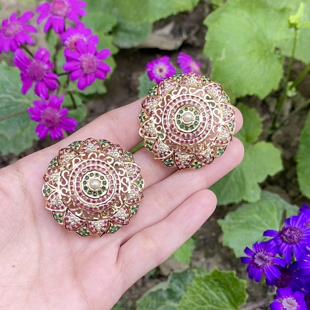 सोने की परत चढ़ी चांदी की स्टड की एक बड़ी जोड़ी। सेटिंग स्टोन ताजे पानी के मोती और रूबी-पन्ना जैसे दिखने वाले लाल और हरे पत्थर हैं।
