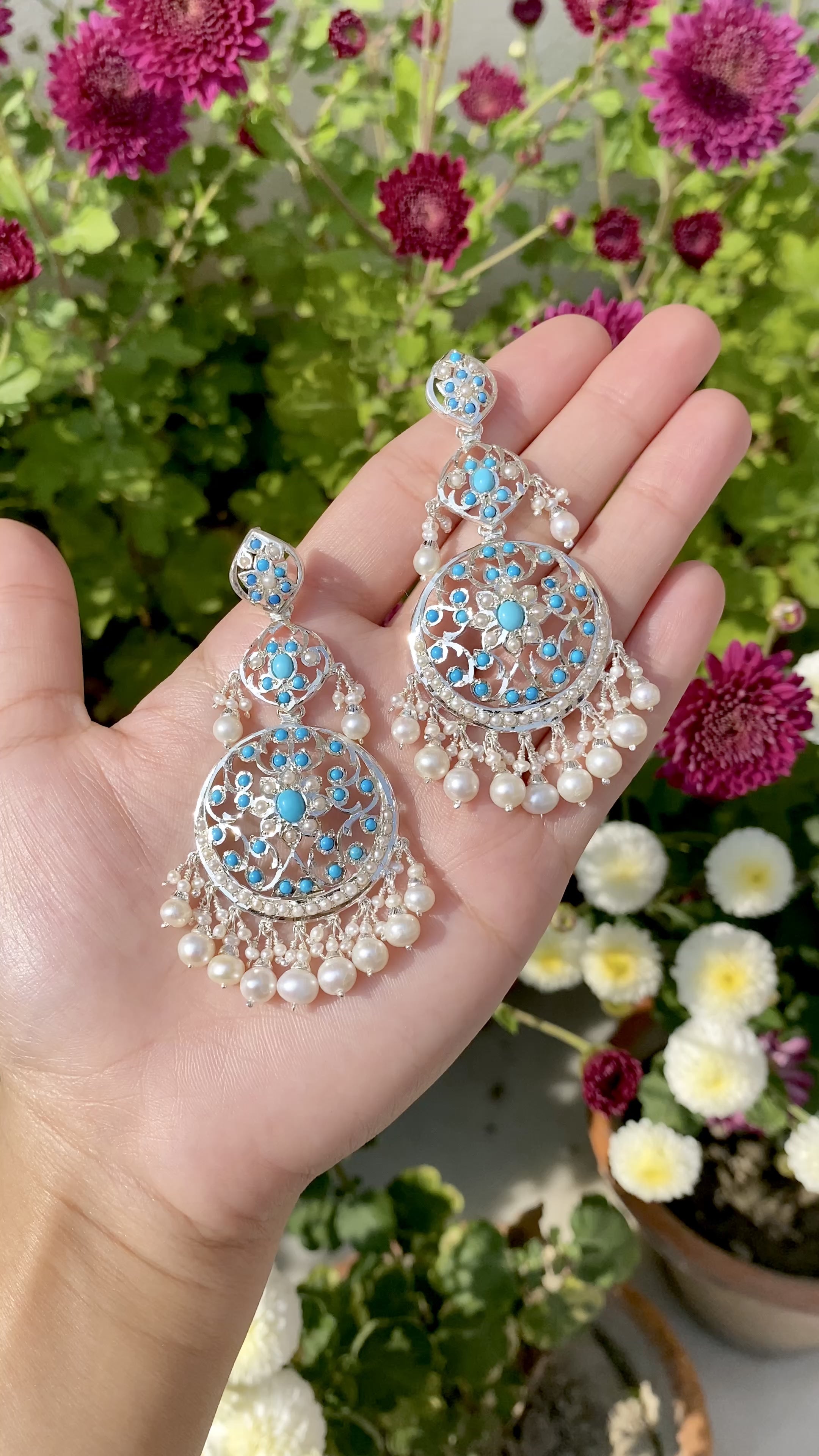 फ़िरोज़ा के साथ सिल्वर डैंगलर्स | पर्ल और फ़िरोज़ा ज्वेलरी SER 057