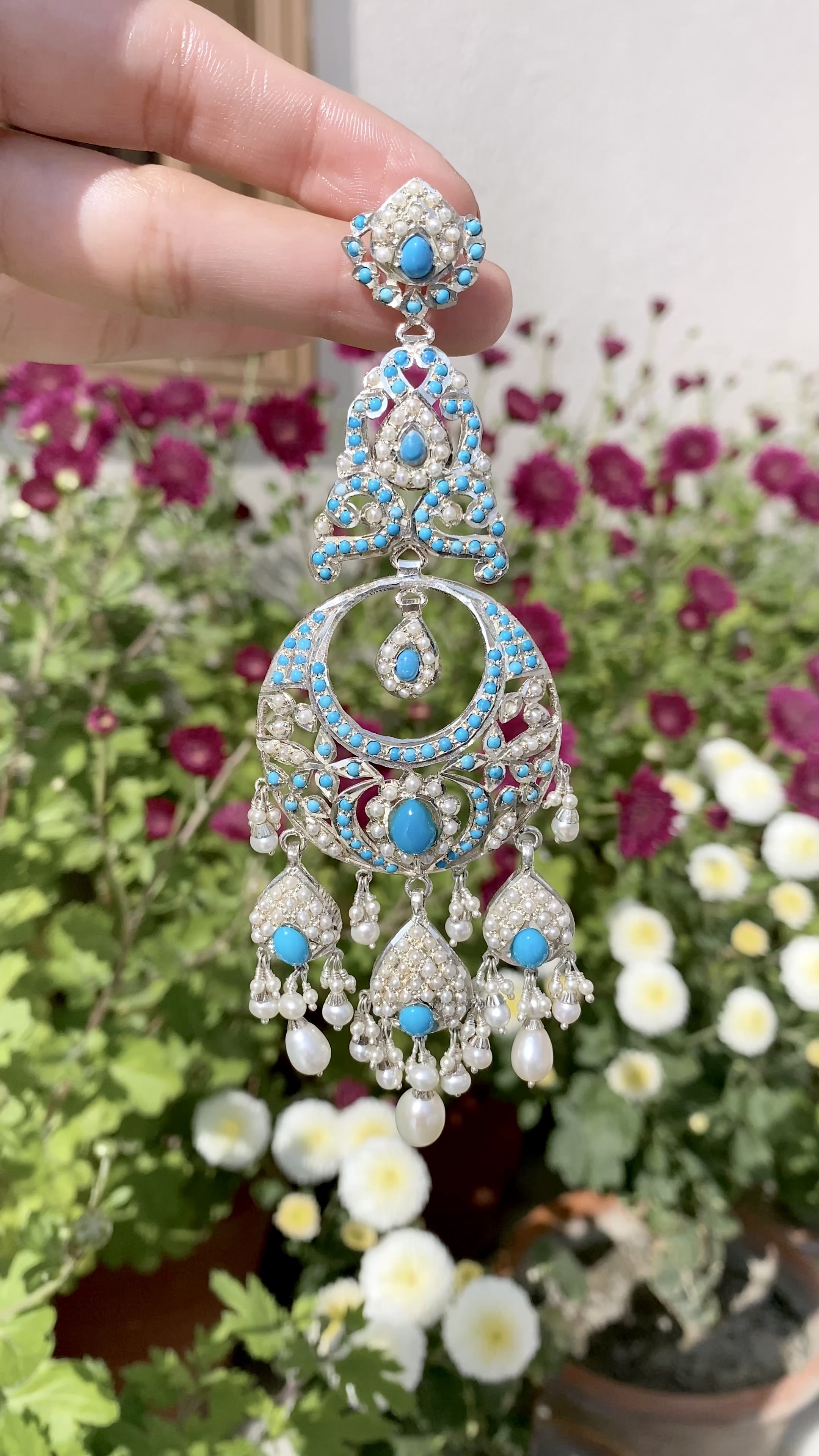 फ़िरोज़ी और मोती की बालियाँ | स्टेटमेंट सिल्वर डैंगलर्स | बोहेमियन SER 047