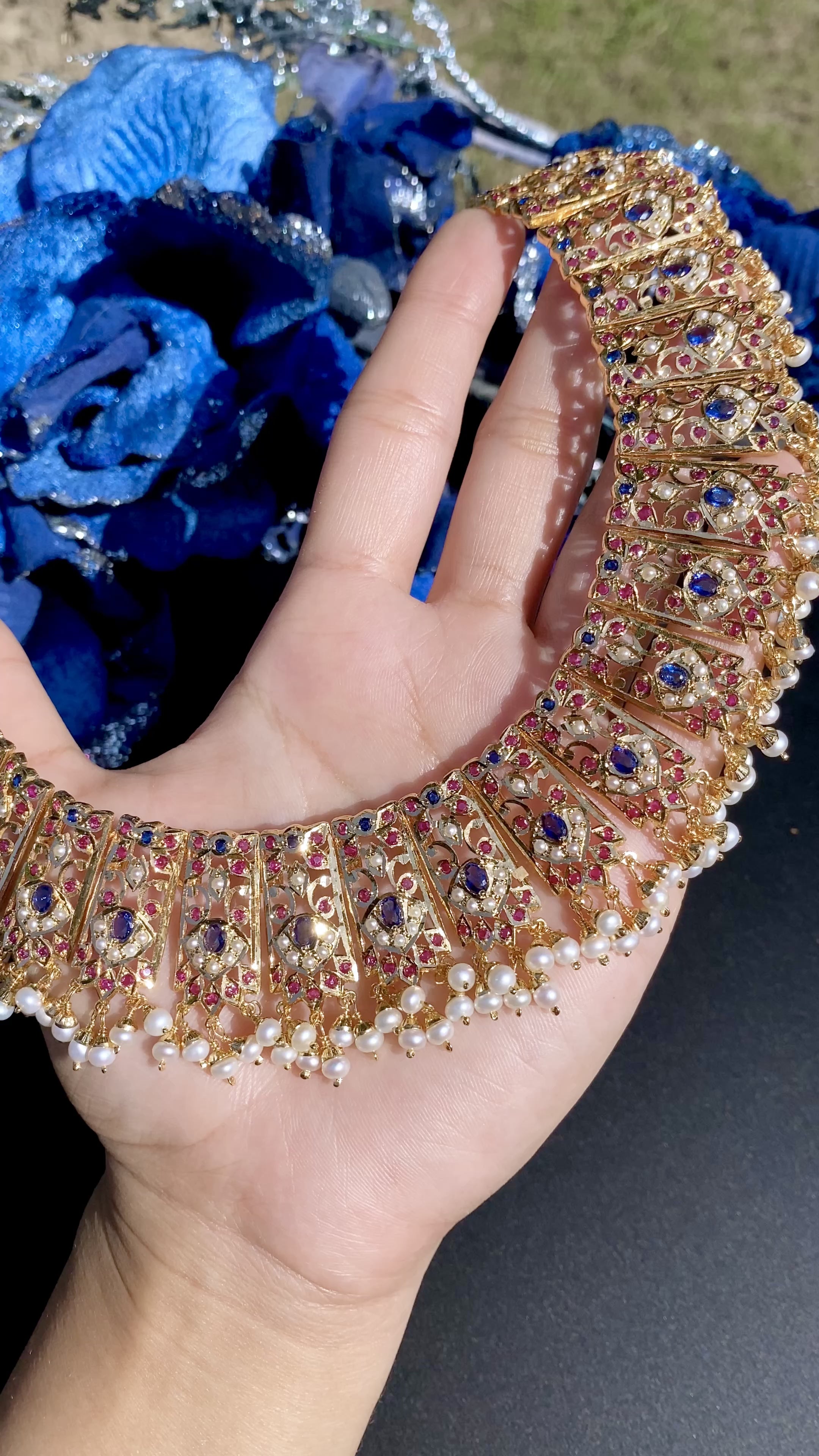 सोने की परत चढ़ा हुआ चांदी का हार सेट रूबी-नीलम जैसे दिखने वाले रंग के पत्थरों और कीमती ताजे पानी के मोतियों से सजाया गया है। हार एक कॉम्प्लीमेंट्री डोरी/टैसल के साथ आता है और झुमके बॉम्बे स्क्रू से बंद होते हैं।