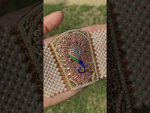 Traditional punjabi jadau bracelet called "Baahi" in 92.5 gold plated silver along with meenakari. All pearls used are freshwater pearls. The stones in setting are synthetic rubies and emeralds of high quality.
