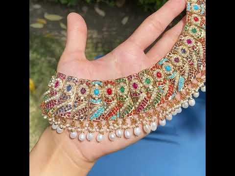 Navrattan necklace set made in 92.5 gold plated silver. The setting stones are a mix of real and synthetic stones. All pearls used are precious freshwater pearls.