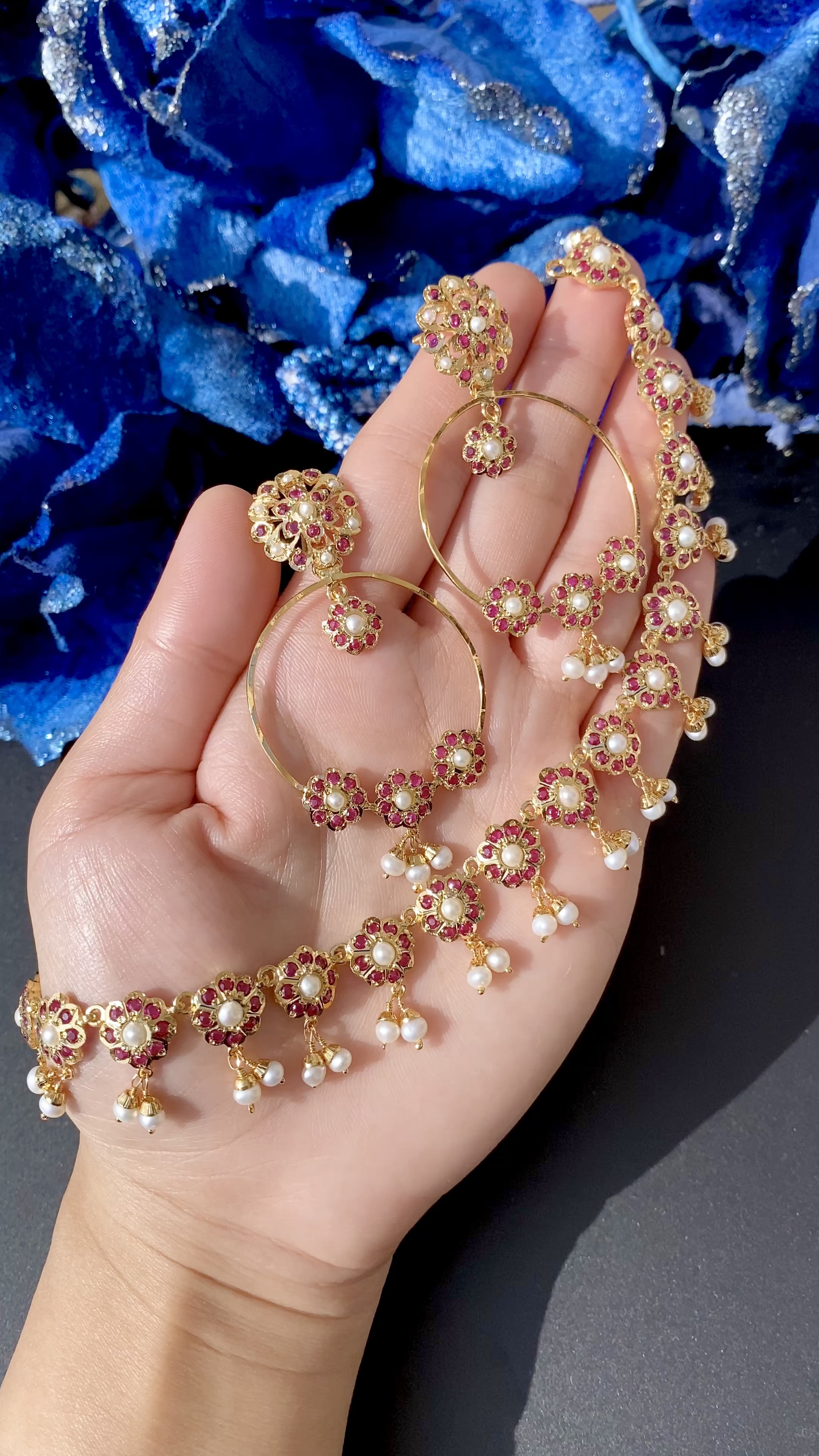 Indulge in elegance with our delicate ruby and pearl necklace with chandbali earrings. Meticulously handcrafted in 925 sterling silver and set with lusturous pearls and vibrant rubies. Elevate your style with this subtle yet impactful accessory adding a touch of sophistication and refinement.