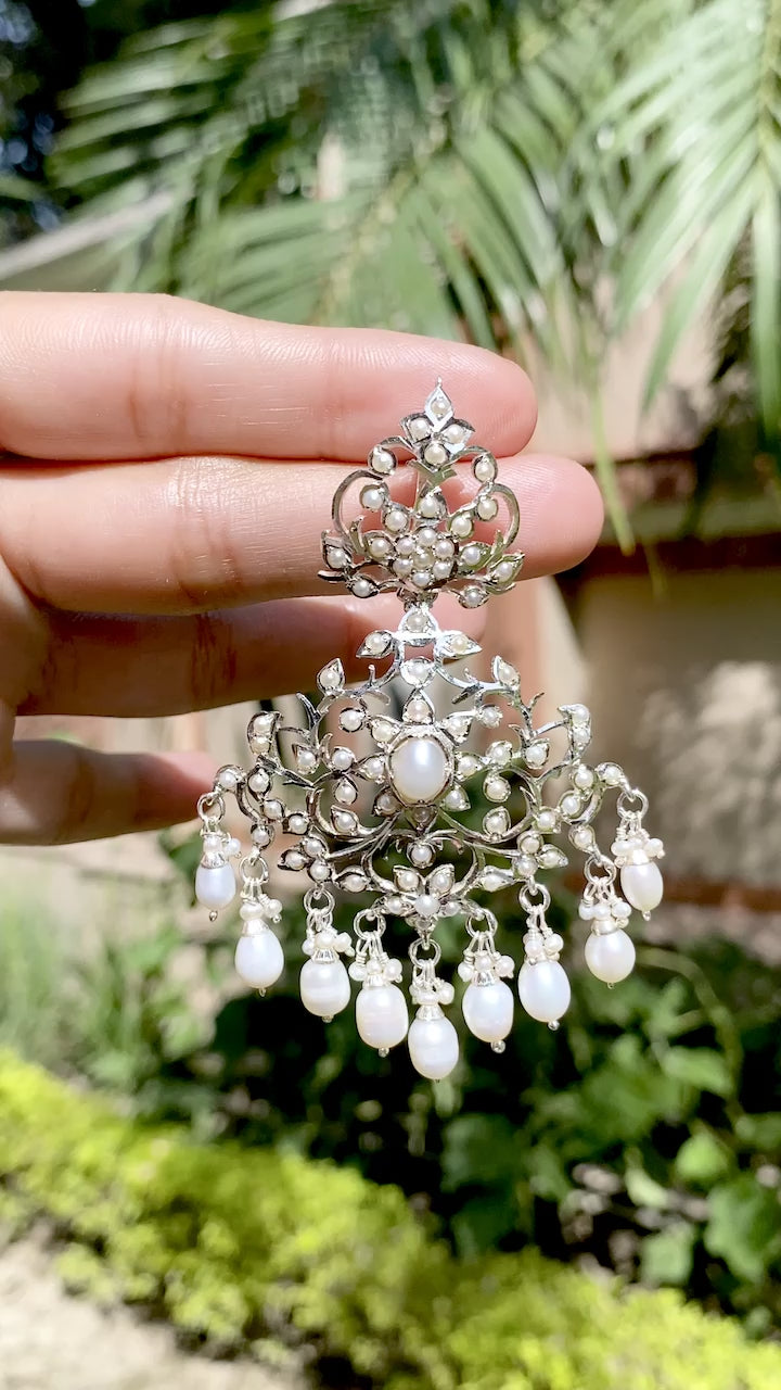 Featuring a pair of finely crafted bohemian earrings in 925 sterling silver. Inspired from the Edwardian Era of jewellery this beautiful piece has been set with precious pearls. This versatile piece of jewellery teams up well indian as well as western outfits.