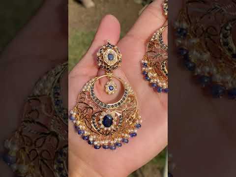 Featuring a pair of large chandbali earrings in 22k gold set with blue sapphires and freshwater pearls. The earrings are approx 3 inches tall and weigh 37gms