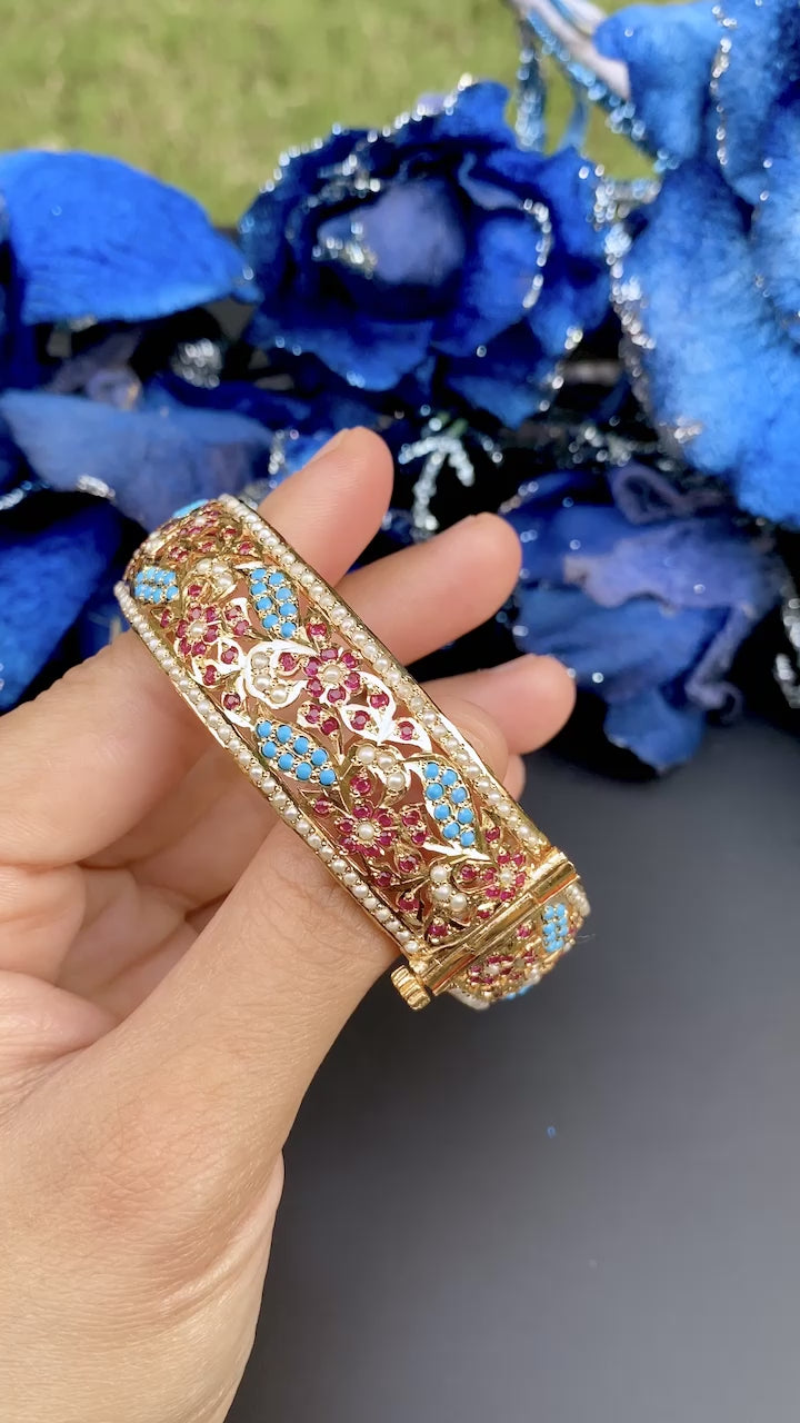 Featuring an openable jadau kara in gold plated silver. It has been handcrafted in 925 sterling silver and embellished with precious pearls, turquoises and rubies.