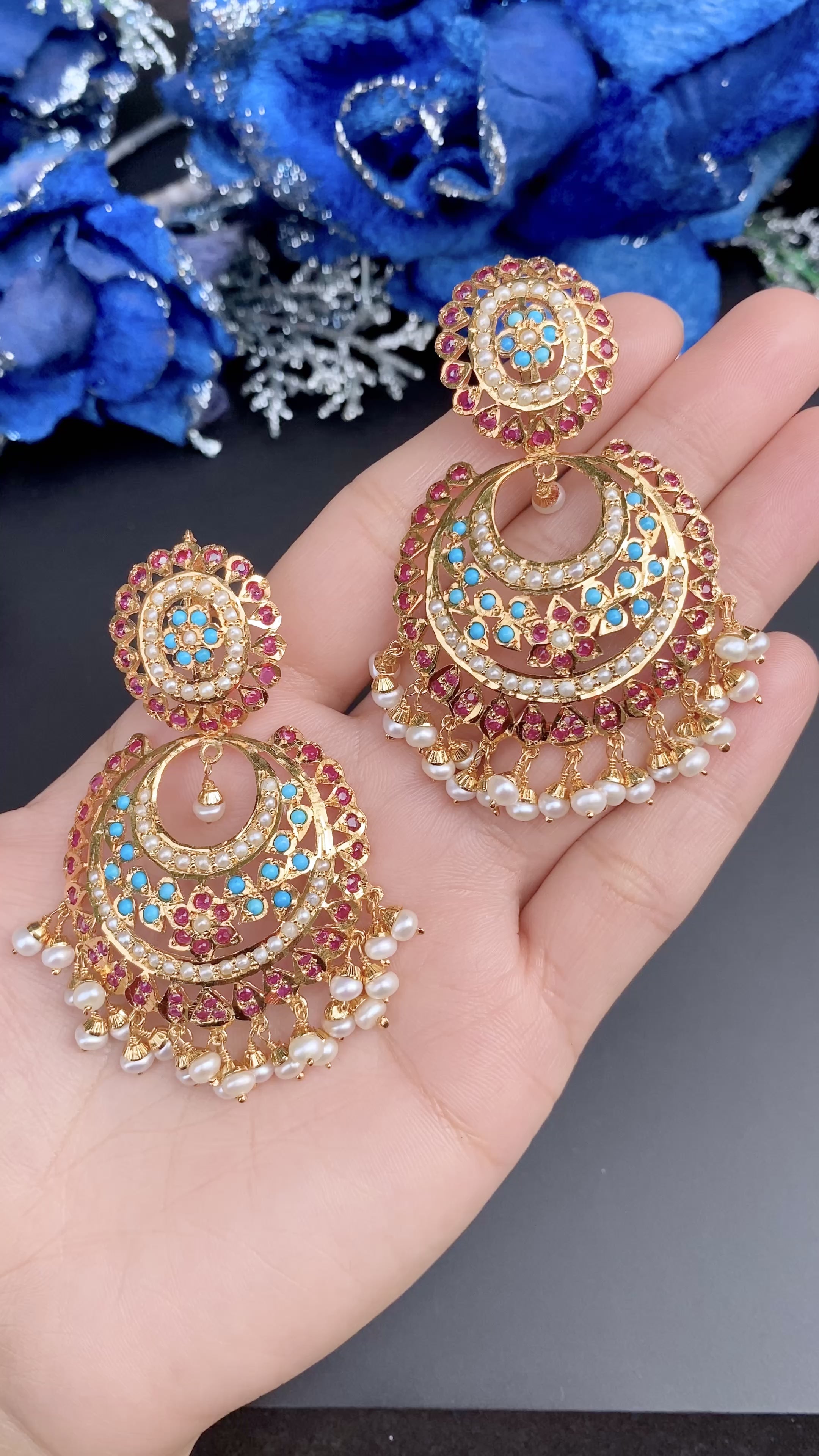 Featuring a pair of gold plated chandbali earrings. Handcrafted in 925 sterling silver and embellished with precious pearls, turquoises and ruby look alike stones. The earrings close with a bombay screw.