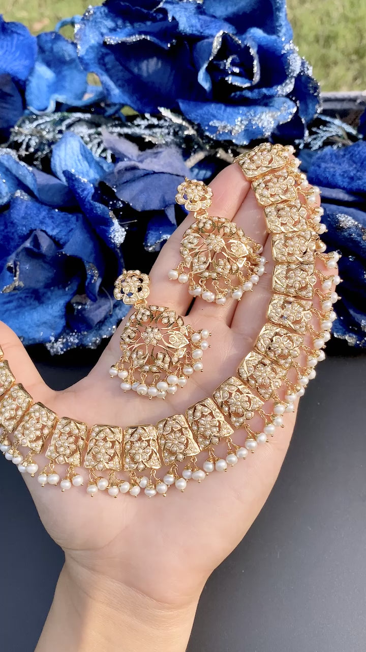Featuring a classic jadau necklace set. This floral designed necklace set has been handcrafted in 925 sterling silver and embellished with precious pearls. The earrings close with a bombay screw and the necklace is supplied with a fancy fabric tassel.