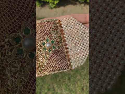 Traditional punjabi jadau bracelet called "Baahi" in 92.5 gold plated silver. All pearls used are freshwater pearls. The stones. in setting are synthetic rubies and emeralds of high quality.