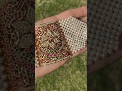 Traditional punjabi jadau bracelet called "Baahi" in 92.5 gold plated silver. All pearls used are freshwater pearls. The stones. in setting are synthetic rubies and emeralds of high quality.