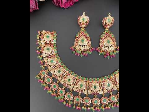 Featuring a broad necklace matched with a pair of earrings in 22k gold, studded with precious rubies, emeralds and pearls.