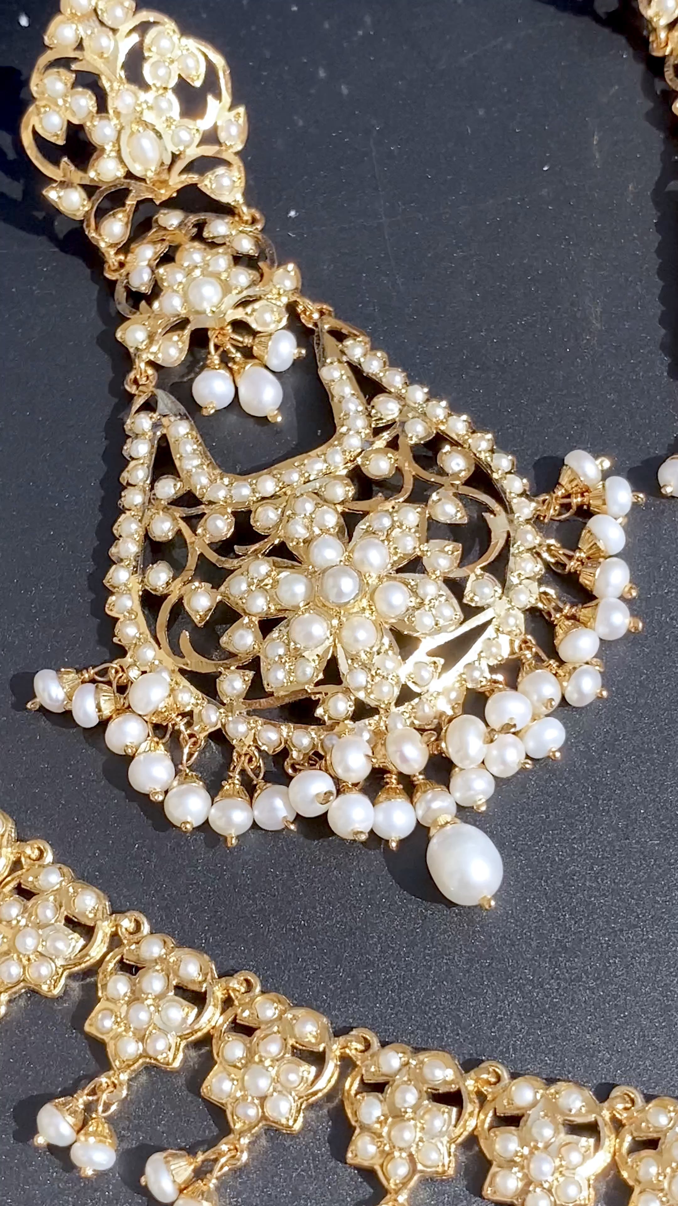Featured is a jadau necklace set studded with freshwater pearls.The necklace is supplied with a fancy tassel/dori and the earrings close with a bombay screw. You can upgrade the necklace to an adjustable length gold plated backchain for an additional Rs 1000.