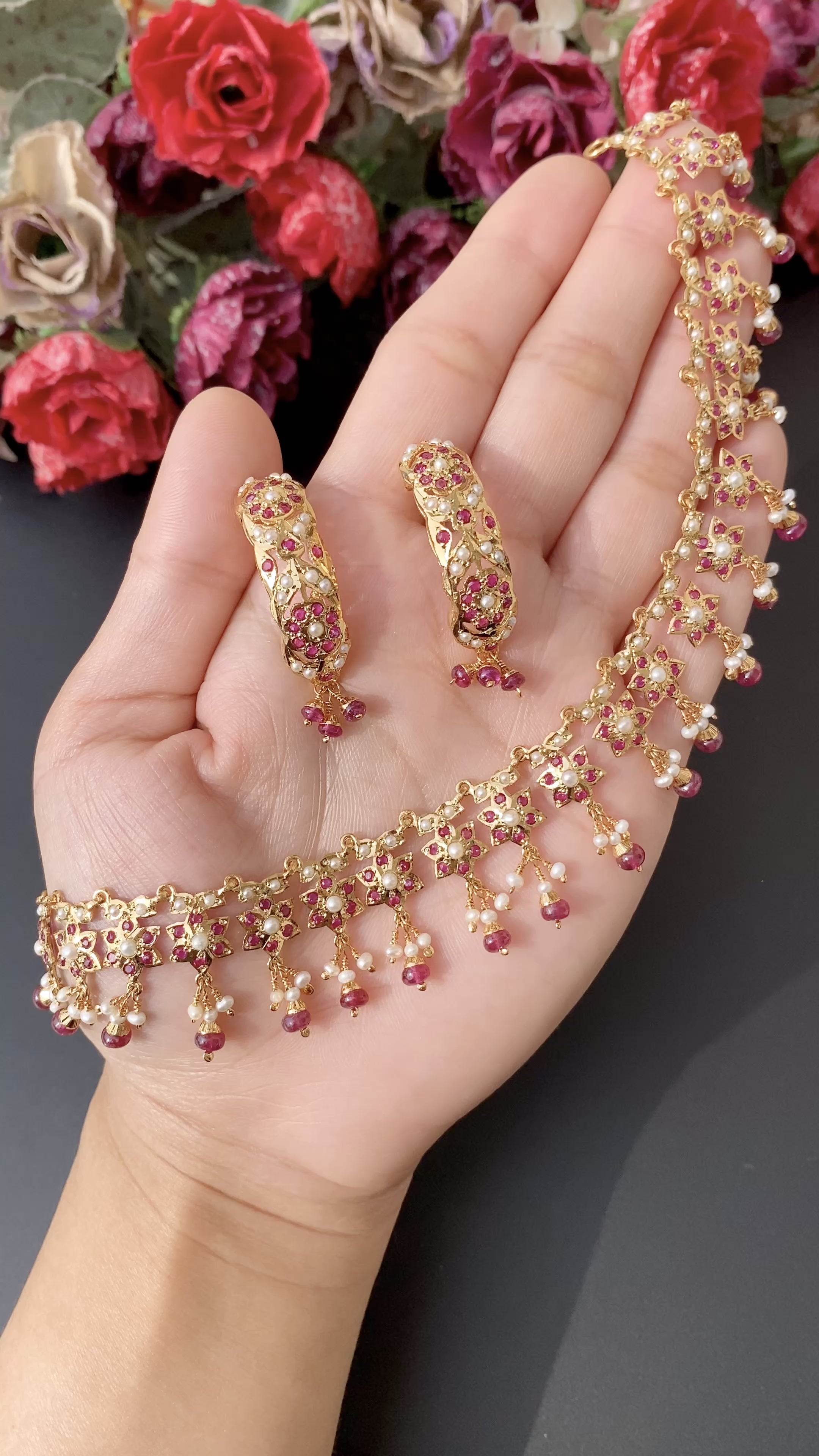 Experience pure elegance with our intricate ruby and pearl choker paired with C-shaped earrings. Expertly crafted from 925 sterling silver, adorned with lustrous pearls and vibrant rubies. Elevate your fashion with this understated yet impactful accessory, adding a touch of refinement and sophistication.