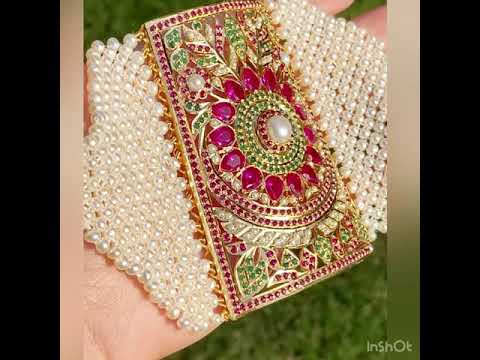 Traditional punjabi jadau bracelet called BAAHI. Embellished with real freshwater pearls, synthetic rubies are emeralds.