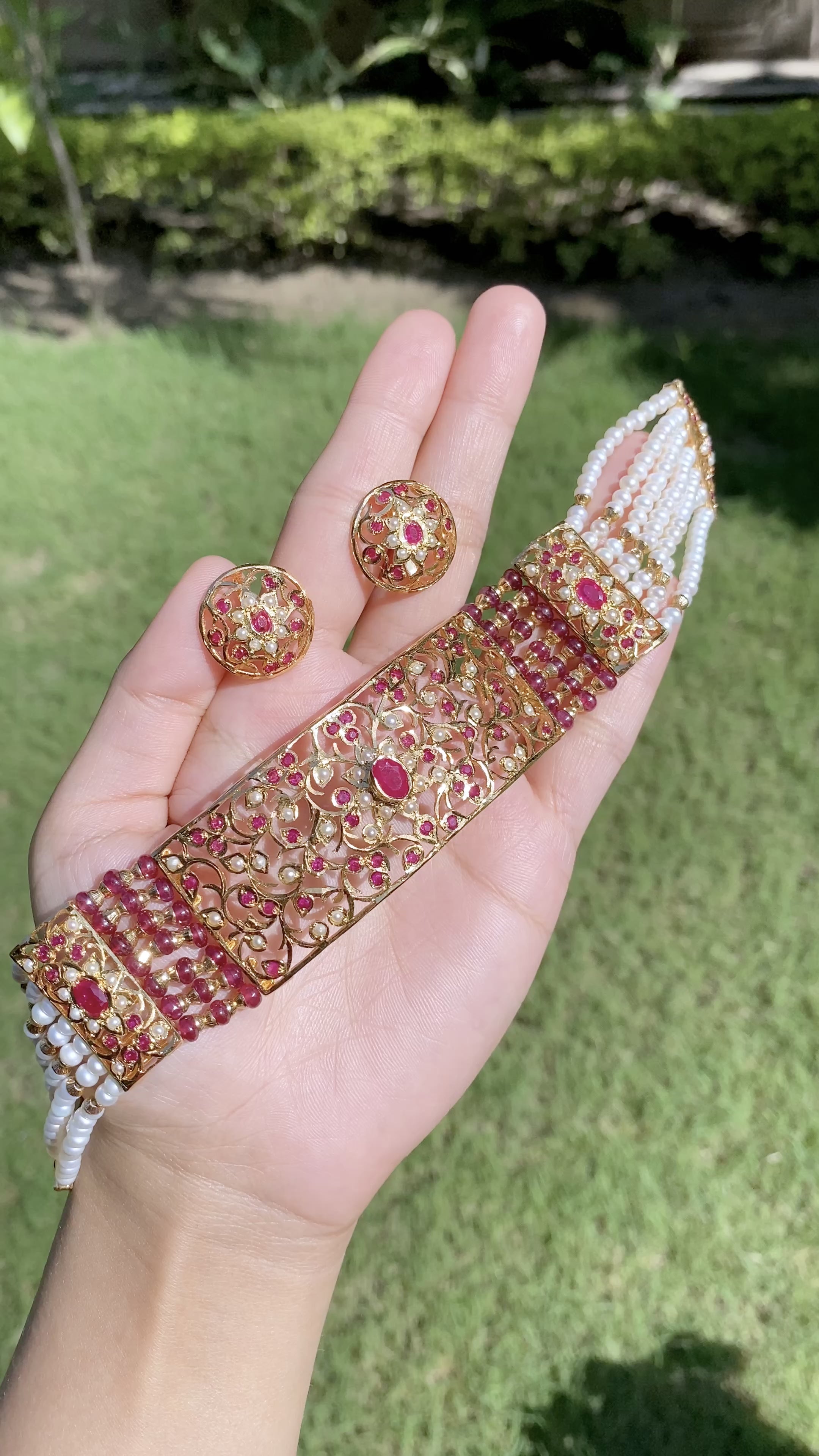 Featuring an elegant and contemporary ruby pearl choker set in 925 sterling silver embellished with precious pearls and ruby beads in the strings. The necklace closes with a fancy fabric tassel and the earrings close with a bombay screw.