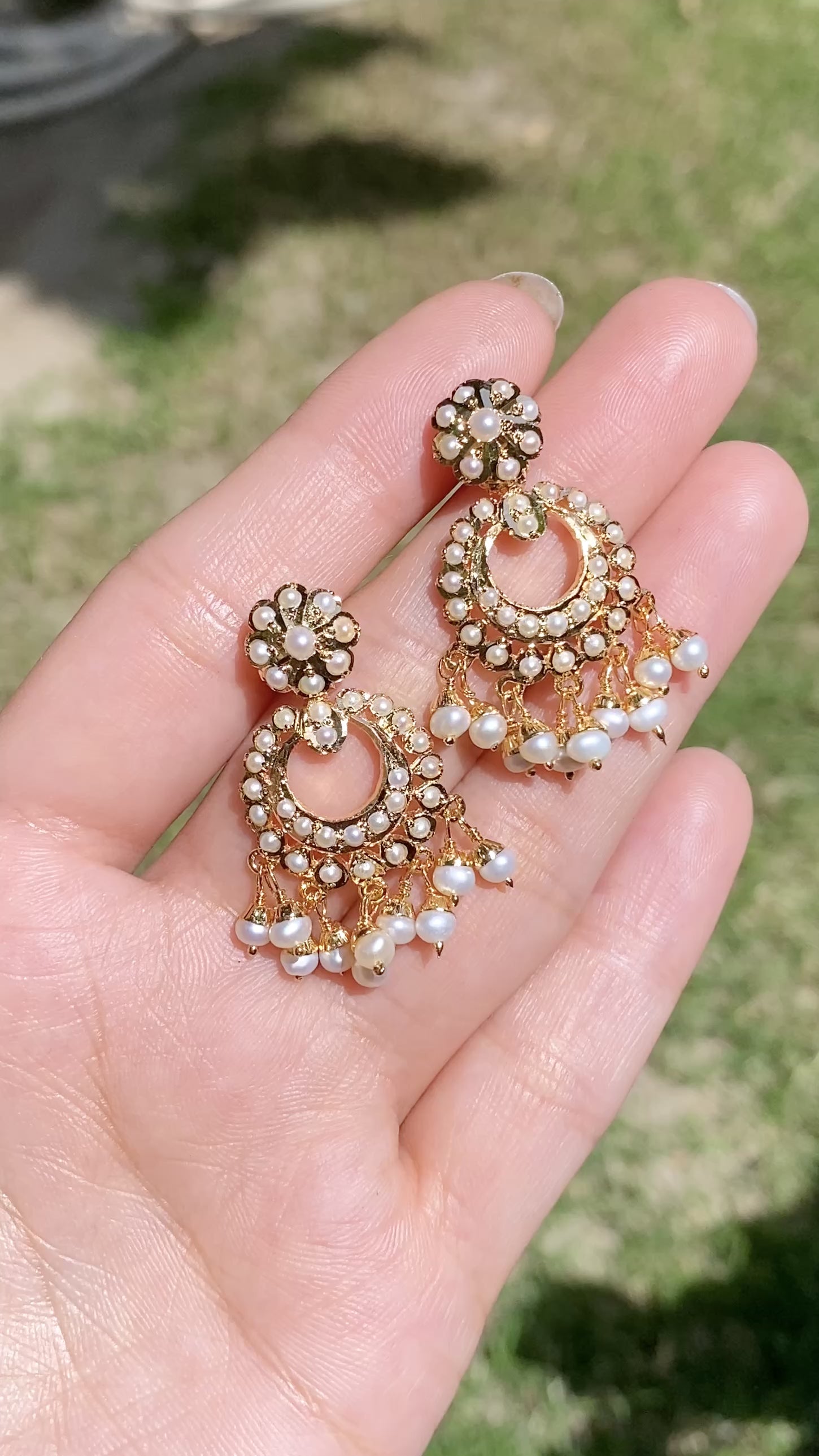 Featured are a pair of small and light weight chandbali earrings, studded with pearls on sterling silver with gold plating. The perfect addition to any outfit, these earrings are a true investment in beauty and sophistication. The earrings close with a bombay screw.