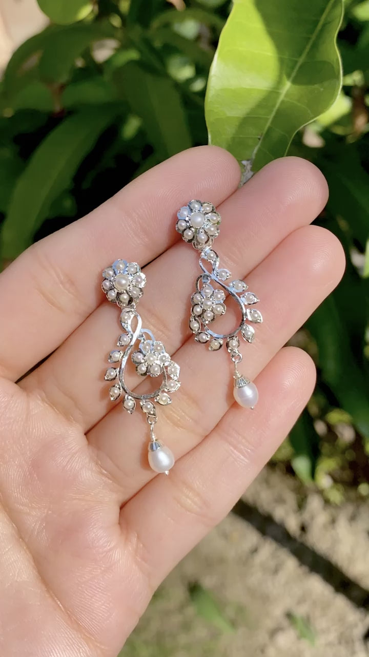 Featuring a pair of dainty indo western design earrings crafted in 925 sterling silver and embellished with precious pearls. The earrings are ultra light to wear and close with a bombay screw mechanism.