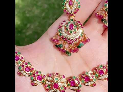 This stunning necklace and earring set features 92.5 gold plated silver, giving it a luxurious and timeless look. Each piece is adorned with real freshwater pearls, synthetic rubies, and emeralds, adding a touch of sophistication and elegance. The hanging beads, made with real rubies and emeralds, provide a delicate yet striking finishing touch to this exquisite set. With this set, you'll be sure to impress and make a statement of refined taste and beauty.