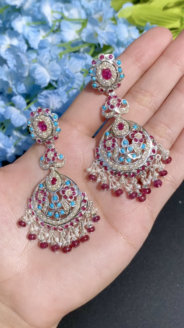 quoiFeaturing a pair of earrings in sterling silver, Handcrafted and set with ruby like red stones, turses and pearls. This fusion jewellery is surely a charmer and would be a treasured piece in your collection