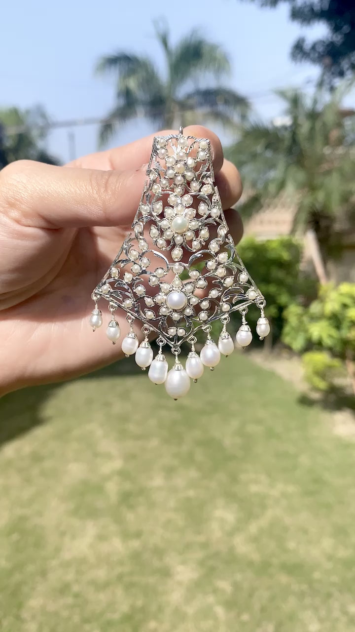 Featuring an indo-western design pair of handmade earrings made in sterling silver, studded with freshwater seed pearls. The perfect combination of traditional elegance and contemporary beauty, these earrings are a timeless must-have for any jewelry collection.