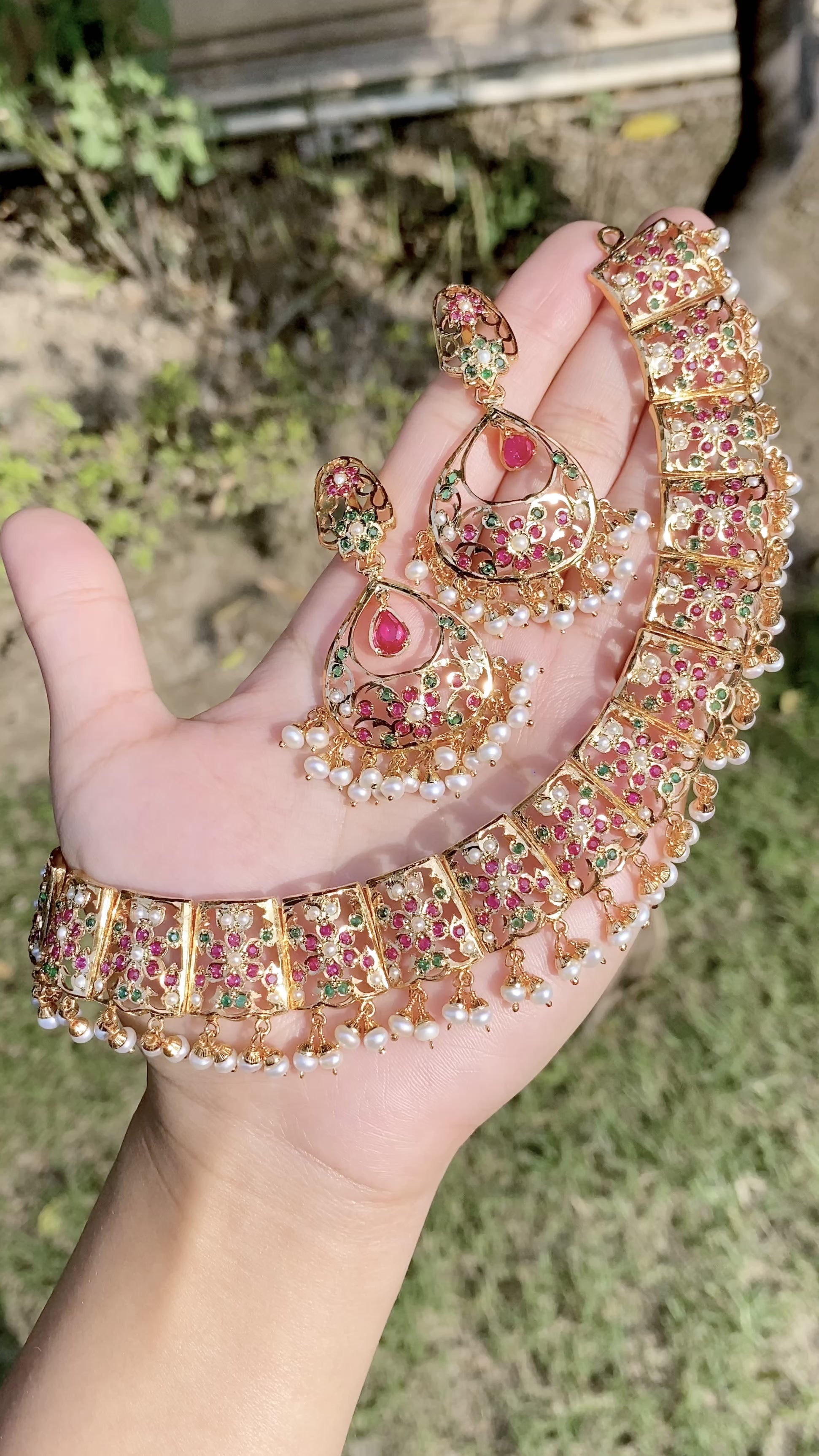 925 స్టెర్లింగ్ వెండితో చేతితో తయారు చేయబడిన మరియు విలువైన ముత్యాలు మరియు సెమిప్రెసియస్ కెంపులు మరియు పచ్చలతో అలంకరించబడిన సాంప్రదాయ జాడౌ నెక్లెస్ను కలిగి ఉంది. చెవిపోగులు స్క్రూ బ్యాక్ను కలిగి ఉంటాయి మరియు నెక్లెస్ సర్దుబాటు చేయగల ఫాబ్రిక్ టాసెల్తో వస్తుంది.