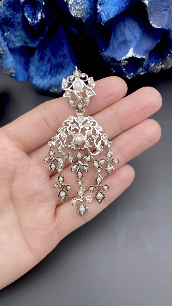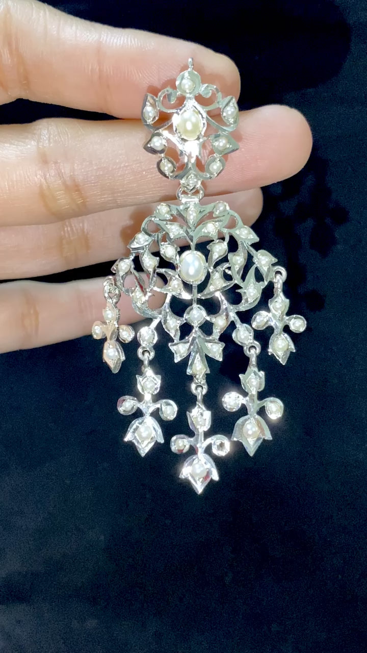 ముత్యాలతో అలంకరించబడిన ఒక జత చక్కగా రూపొందించబడిన వెండి చెవిపోగులను కలిగి ఉంది. అత్యుత్తమ పదార్థాలతో తయారు చేయబడిన ఈ చెవిపోగులు కలకాలం, అధునాతనమైన రూపాన్ని అందిస్తాయి. చెవిపోగులు బొంబాయి స్క్రూతో మూసివేయబడతాయి.