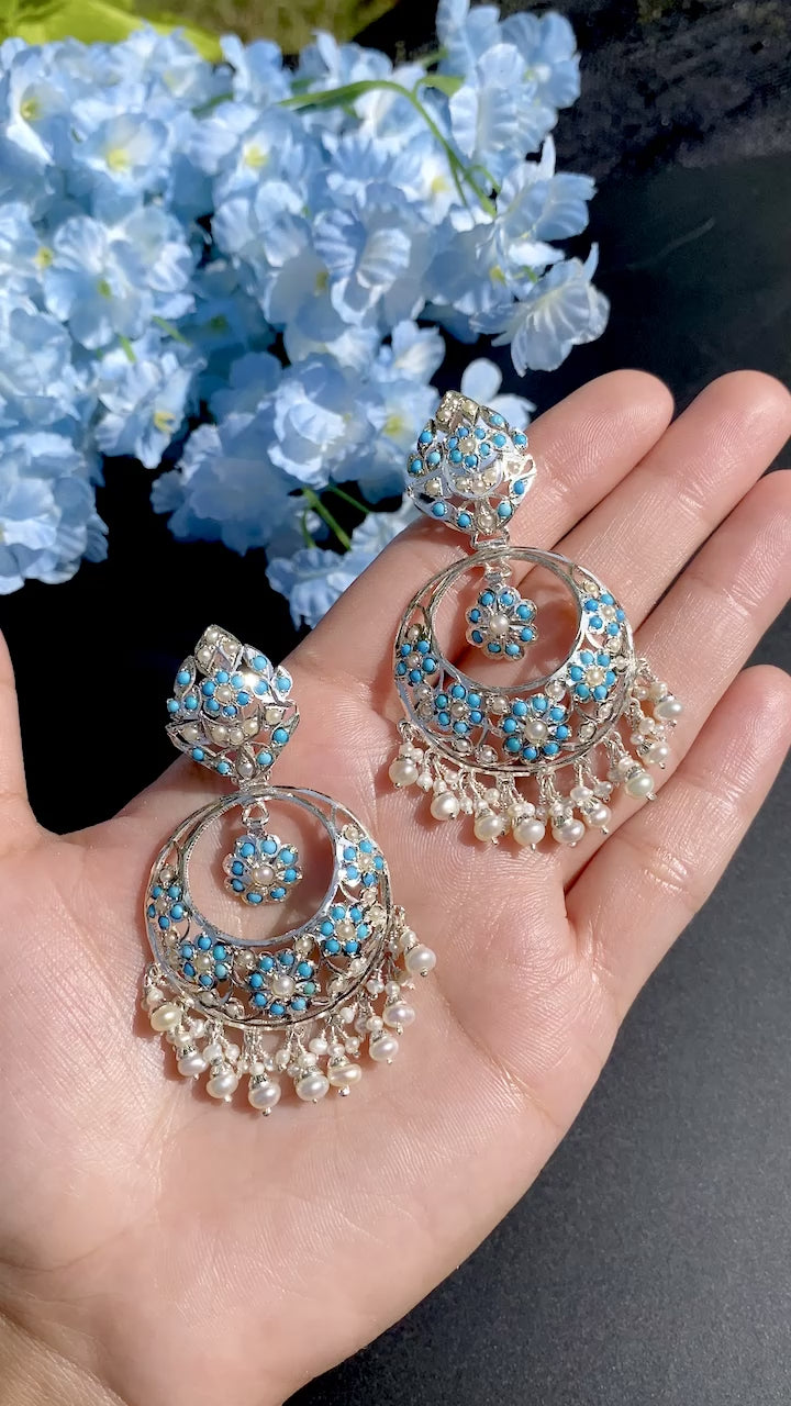 తెల్లటి వెండిపై ముత్యాల ఫిరోజా చంద్బాలీ | జదౌ ఆన్ 925 సిల్వర్ SER 008