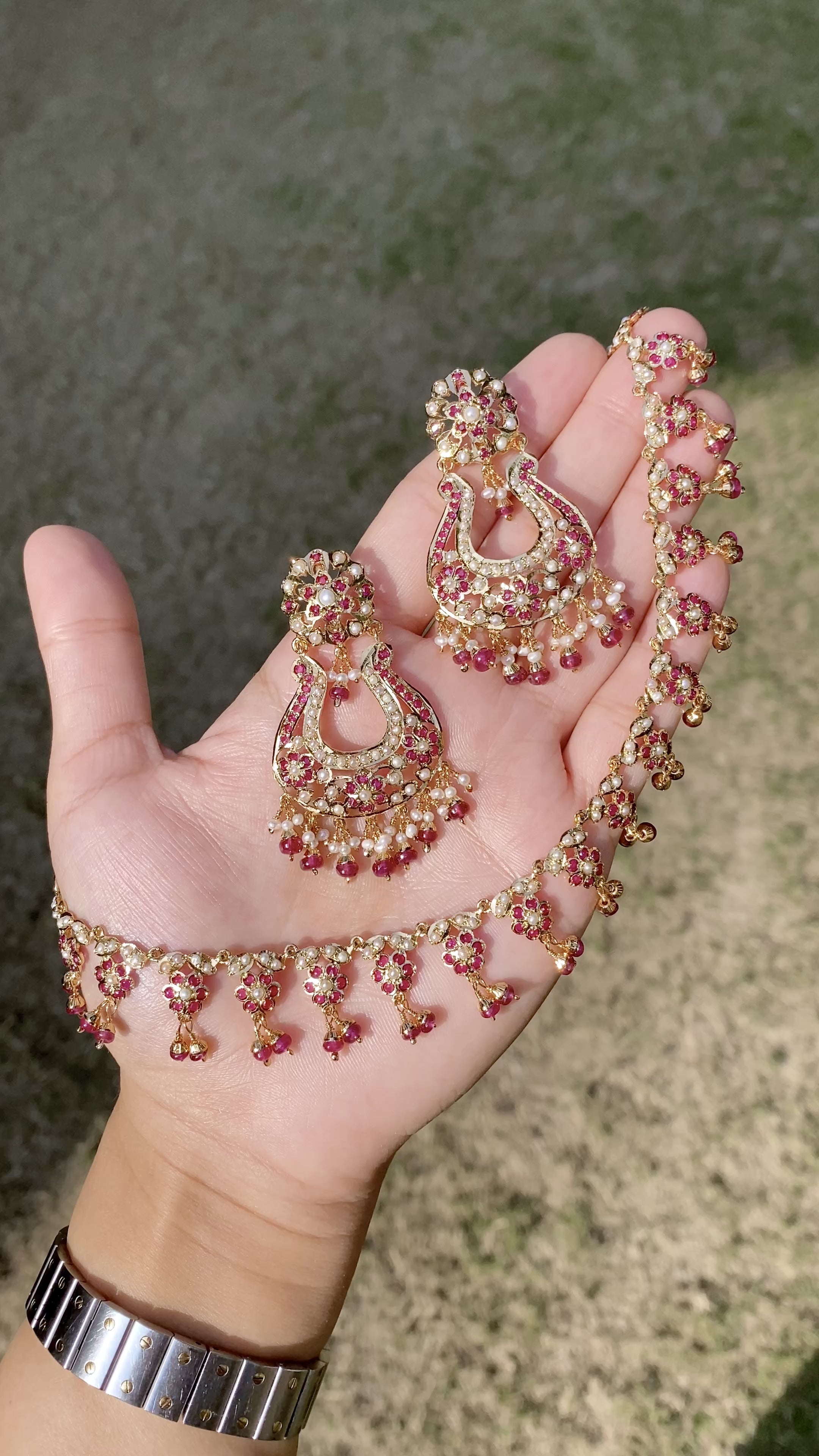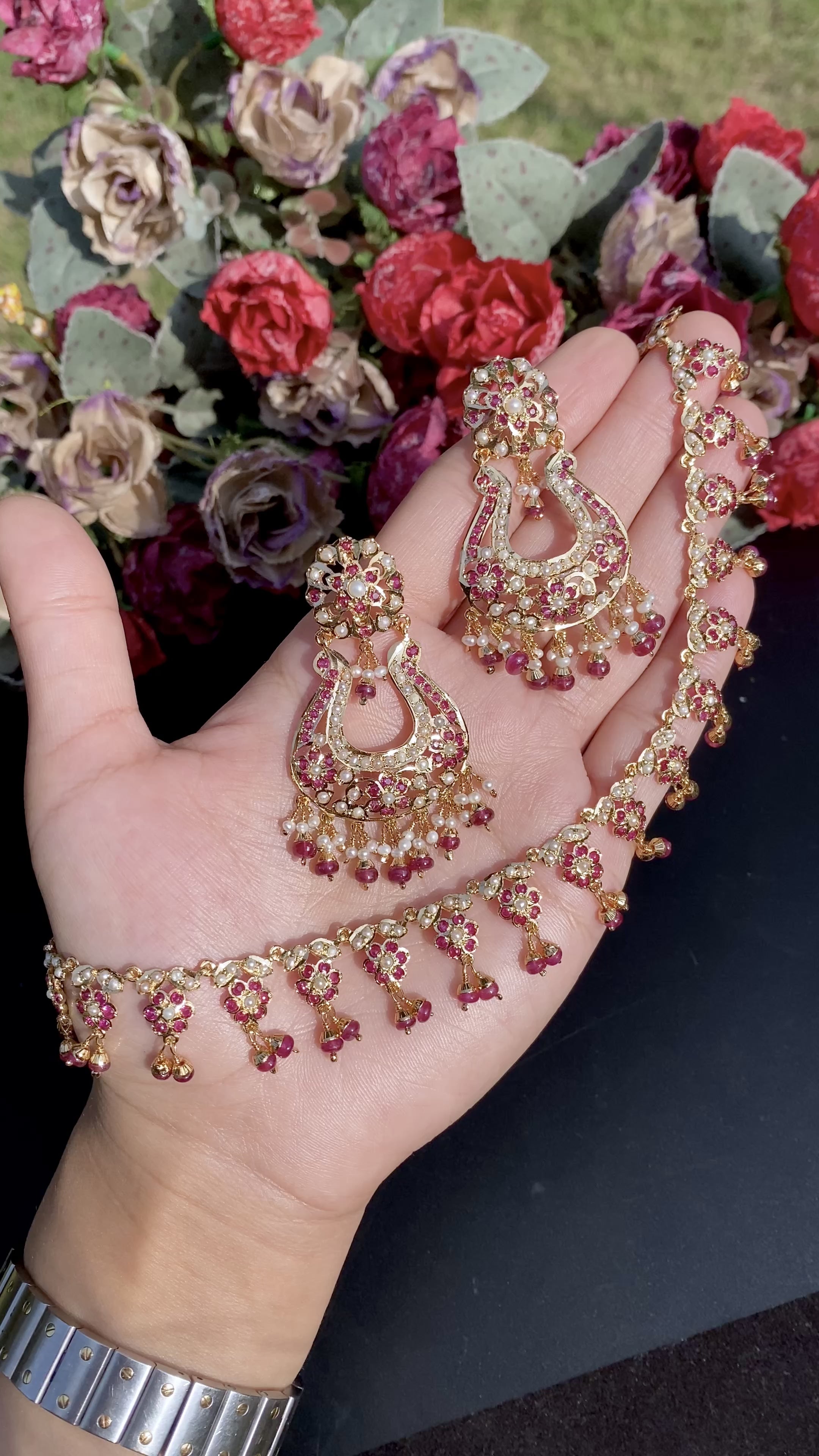 సున్నితమైన రూబీ నెక్లెస్ | చాంద్బాలీ స్టైల్ చెవిపోగులతో | బంగారు పూత పూసిన ఆభరణాలు NS 240