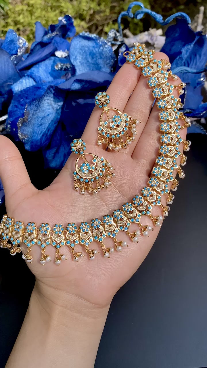925 స్టెర్లింగ్ వెండితో చేతితో తయారు చేసిన సొగసైన మరియు సరళమైన మణి / ఫెరోజా మరియు పెర్ల్ నెక్లెస్ సెట్ను కలిగి ఉంది. బాంబే స్క్రూ మెకానిజంతో చెవిపోగులు మూసివేయబడతాయి.