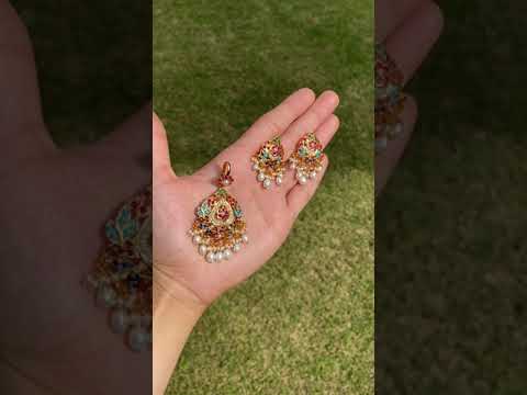 విలువైన మంచినీటి ముత్యాలు మరియు నిజమైన మరియు సింథటిక్ నవరతన్ రాళ్ల మిశ్రమంతో అలంకరించబడిన బంగారు పూత పూసిన వెండిపై లాకెట్టు. వేలాడే ముత్యాలు మంచినీటి ముత్యాలు కూడా.