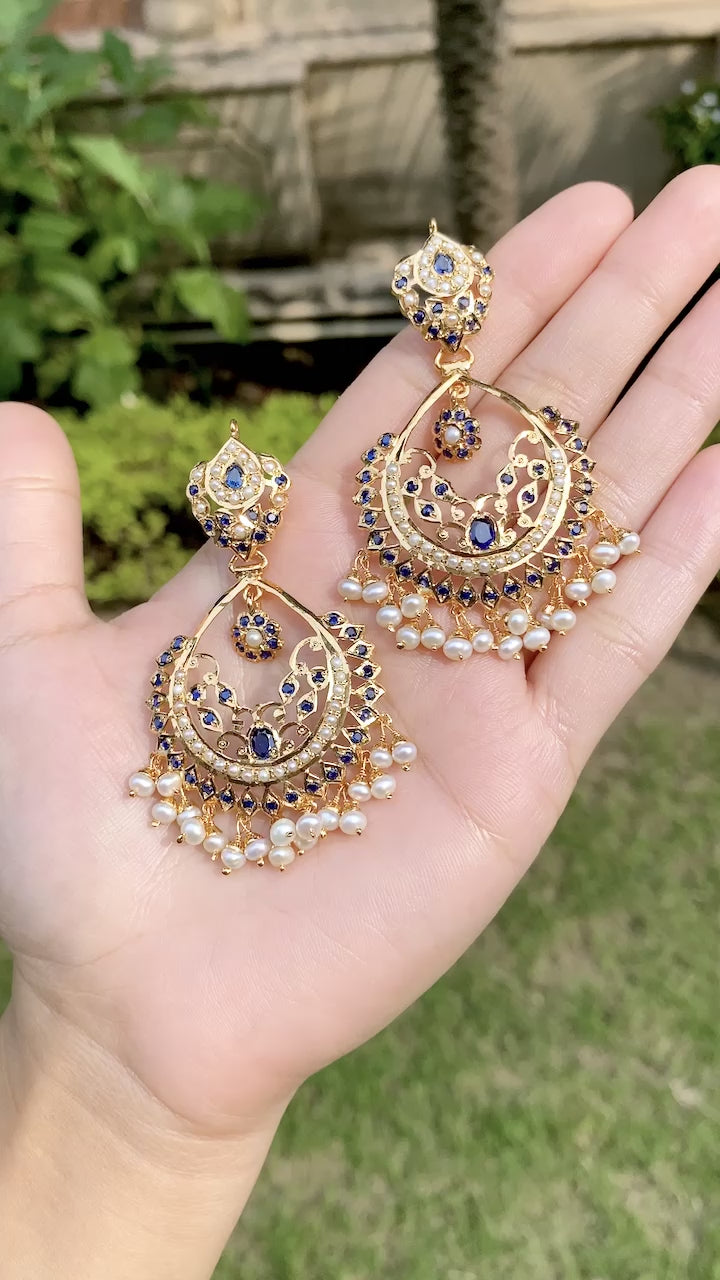 బంగారు పూత చంద్బాలీ | బ్లూ నీలమణి & ముత్యాల చెవిపోగులు | జదౌ జ్యువెలరీ ER 543