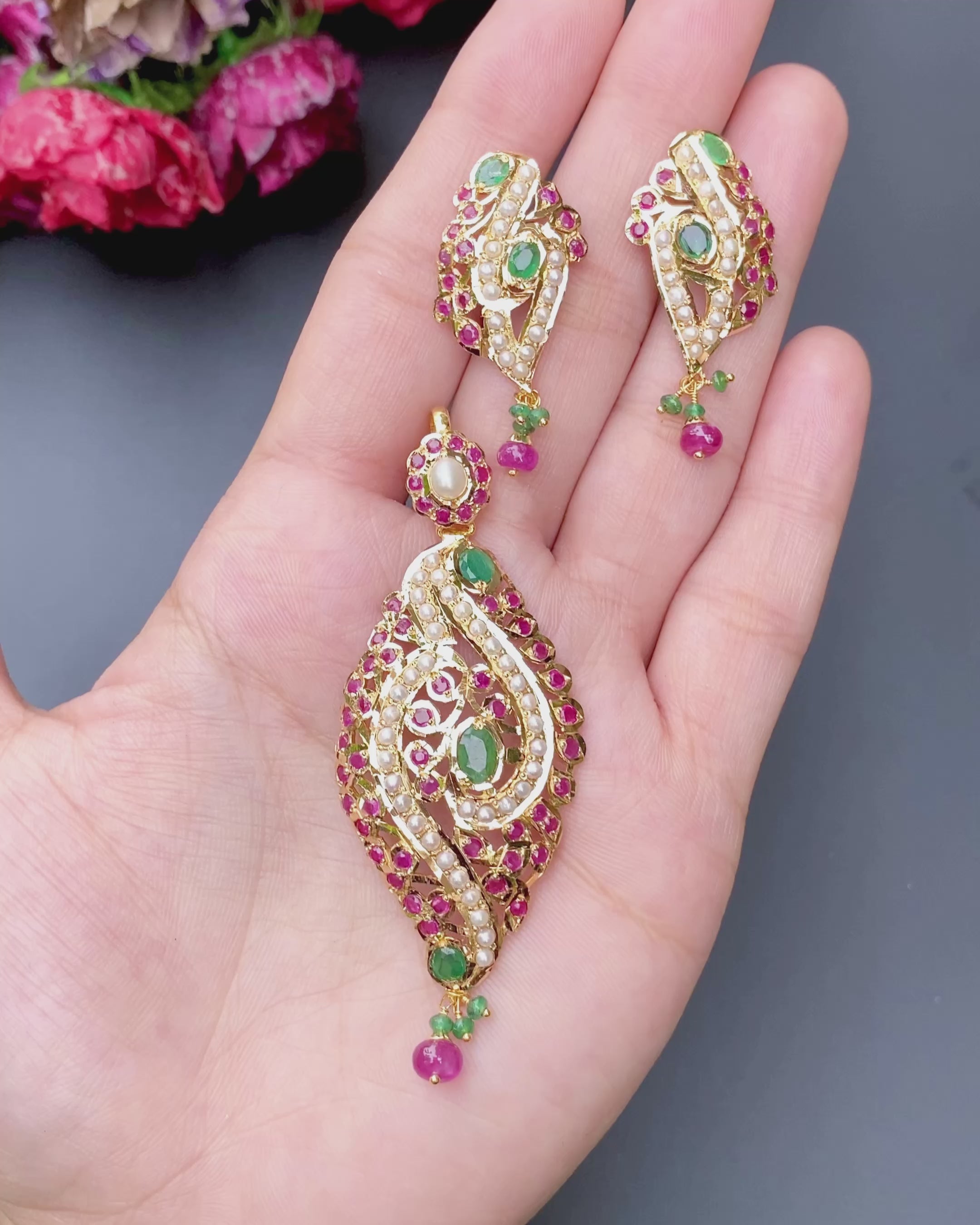 రంగురంగుల జడౌ లాకెట్టు సెట్ను 22వ బంగారంతో తయారు చేసి, కెంపులు, పచ్చలు మరియు ముత్యాలతో అలంకరించారు.