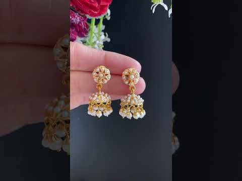 22k గోల్డ్లో చిన్న మరియు సొగసైన జడౌ పెర్ల్ ఝుమ్కీల జత ఫీచర్ చేయబడింది. జుమ్కీ చెవిపోగులు వేలాడుతున్న ముత్యాల పూసలలో 1.15 గ్రాములతో సహా 11.1 గ్రాముల బరువు కలిగి ఉంటాయి.