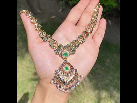 92.5 బంగారు పూత వెండితో తయారు చేయబడిన తేలికపాటి నెక్లెస్ సెట్. ఇది విలువైన మంచినీటి ముత్యాలు మరియు సింథటిక్ పచ్చలు & నీలి నీలమణితో సెట్ చేయబడింది. వేలాడే పూసలు విలువైన మంచినీటి ముత్యాలు మరియు చక్కటి బర్మీస్ బ్లూ నీలమణి.