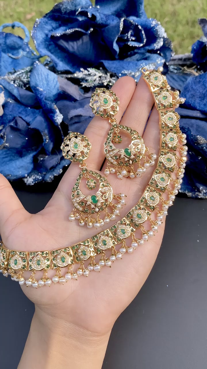 బంగారు పూత పూసిన పచ్చ సెట్ | సాంప్రదాయ భారతీయ నెక్లెస్ సెట్ డిజైన్ NS 225