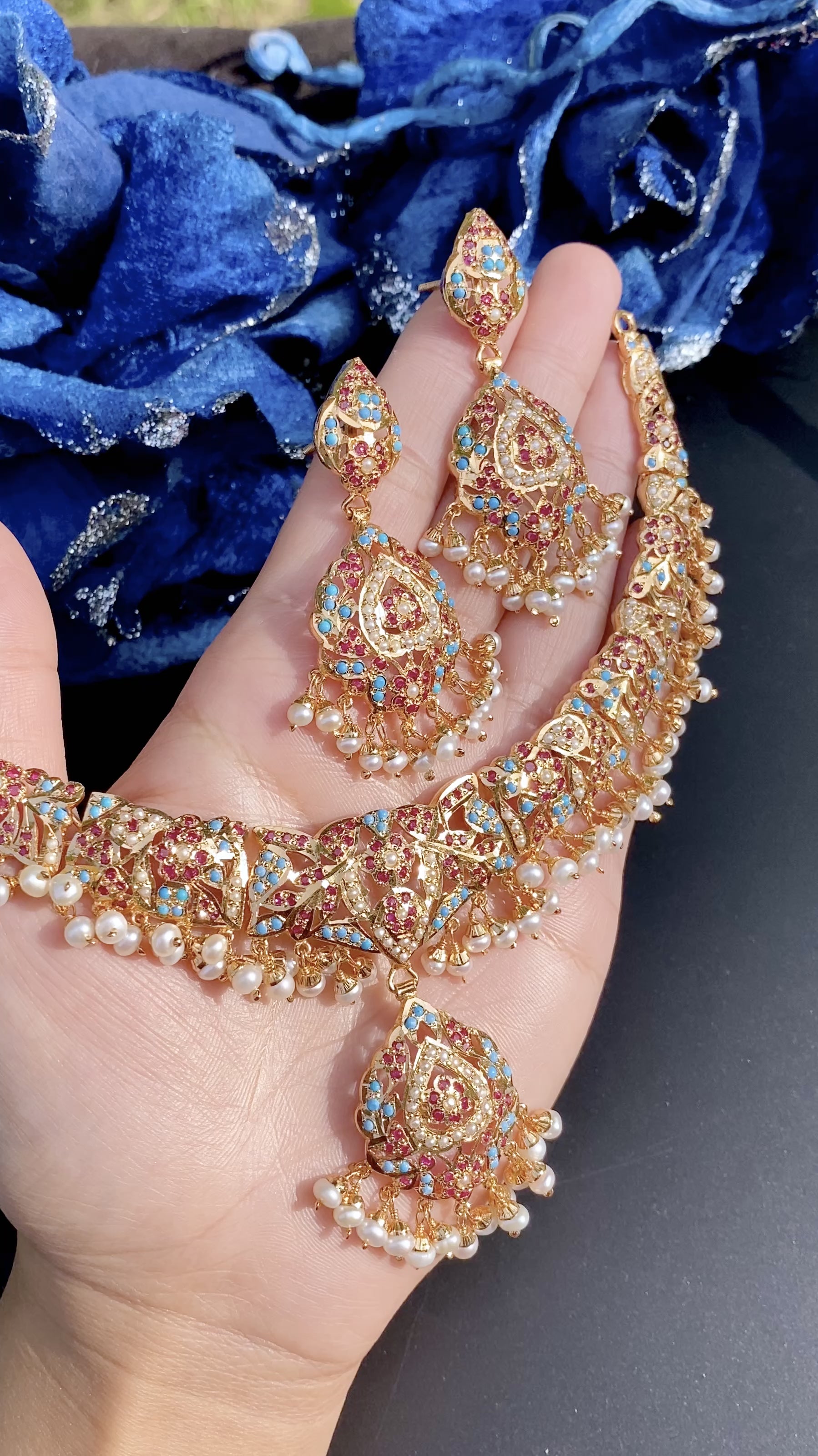 925 స్టెర్లింగ్ వెండితో చేతితో తయారు చేసిన సాంప్రదాయ భారతీయ నెక్లెస్ సెట్ను కలిగి ఉంది. ఇది జడౌ టెక్నిక్ ఆఫ్ జ్యువెలరీ మేకింగ్ ఉపయోగించి విలువైన ముత్యాలు, మణి మరియు కెంపులతో అలంకరించబడింది. సాంప్రదాయ జడౌ టెక్నిక్తో అద్భుతంగా రూపొందించబడిన ఈ నెక్లెస్ సెట్ 925 స్టెర్లింగ్ సిల్వర్లో సెట్ చేయబడిన మెరిసే ముత్యాలు, వైడూర్యాలు మరియు కెంపులతో అబ్బురపరిచే కళాత్మకత యొక్క శాశ్వతమైన భాగం.
